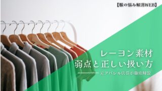素材辞典 レーヨン素材の弱点と正しい扱い方【元アパレル店長が徹底解説】 レーヨン素材の弱点を元アパレル店長が解説。縮む・シワ・濡れに弱い・伸びるなどの特徴と、正しい洗濯方法、扱い方、選び方、混紡素材のメリットまでわかりやすくまとめました。 2025.11.29 素材辞典